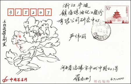 名人笔迹--洛阳罗志刚画牡丹手绘实寄封欣赏