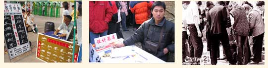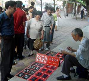 28日下午,在成都市城区百货大楼旁看到一签名设计摊生意十分火爆,只要给10元钱,就可拿到签名设计者为你设计的三种不同签名形式。据这位签名设计者介绍:他从事这职业有4年时间了,每天收入都有几十元不等,曾去过省内各大城市。(中国签名网)