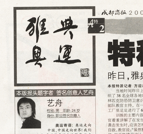 艺舟老师为《成都商报2004奥运会特刊》题词!