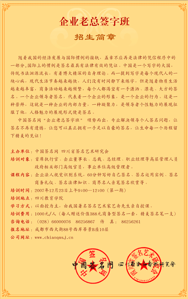 中国签名网“企业老总签字班”招生简章!