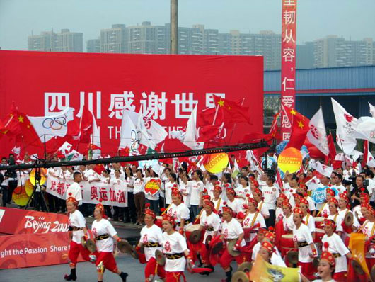 2008年北京奥运会我想是每个中国人都值得期待的一天,同时也是每个中国人的骄傲!而火炬成都的传递,更是我们四川人期待的日子,原本火炬接力成都传递在6月17日晚上,奥运圣火运行团队抵达都江堰市,6月18日上午8:00在都江堰市举行起跑仪式并在都江堰市传递,都江堰市传递全程7公里,运行时间90分钟;11:00在金沙遗址博物馆南门外举行迎接圣火到达和起跑仪式,此后经杜甫草堂、武侯祠等,最后到达天府广场结束传递,市区传递全程37公里,运行时间300分钟。可是突如其来的天灾---地震!而就是在5.12那天,它来的是那么的突然,那么的无情!让我们失去了亲人、朋友,失去了家园,可我们四川人没有被突如其来的灾难所吓到!所以奥运火炬在成都的传递只有推迟到8月份!