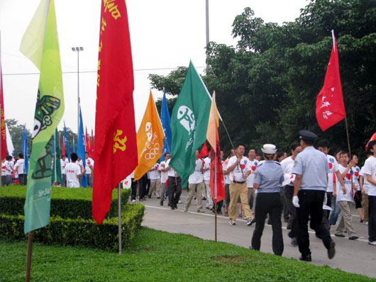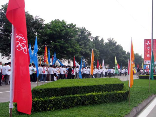 昨天刚下过雨的成都,今天早上开始放晴,空气湿润,凉爽舒适。早上8点,起跑仪式在成都出口加工区举行。早上7时许,众多成都市民就已经聚集在这里,挥舞着各种彩旗,为即将到来的奥运圣火加油助威。起跑前,全体与会者向汶川大地震遇难者默哀一分钟,起跑仪式现场周围众多民众默默为地震灾区祈祷。