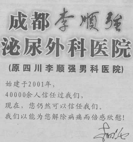 李顺强简介: 男科学教授,毕业于重庆医科大学医疗系。历任重庆市计划生育科研所所长、四川生殖卫生学院院长等职。从事男性生殖医学研究、临床应用及技术推广30年来,先后取得科研成果17项,其中8项获得国家发明奖及部委级科技进步奖;在国内外发表研究论文58篇,参编专著18部,其中包括全国医学院校统编教材《男科学》在内的主编4部;主持了国家“六·五”、“七·五”、“八·五”、“九·五”攻关项目的研究;现任《中国男科学杂志》等7种生殖医学杂志编委、中华医学会男科学会常委、中西医结合男科学会筹委会委员、国家计生委专家委员会委员、四川省政府科学技术顾问团顾问及四川省政协委员等职。
